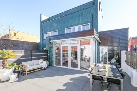 Via de entree bereikt u de straatgerichte, ruime open keuken van ca. 27 m². Deze is modern uitgevoerd en voorzien van diverse inbouwapparatuur, waaronder een vaatwasser, afzuigkap, vriezer, koelkast, combimagnetron, oven en een inductiekookplaat. Tevens voorzien van een Quooker. Dubbele taatsdeuren geven toegang tot de uitgebouwde, tuingerichte woonkamer van ruim 38 m². De massief hardhouten vloer van Afzeliahout, de lichtkoepel en de grote raampartijen zorgen voor een warme uitstraling en veel lichtinval. Vanuit de woonkamer leiden openslaande deuren naar de zonnige achtertuin op het westen, die tevens toegang biedt tot de garage met elektrische deur en meer dan voldoende ruimte voor een grote auto.