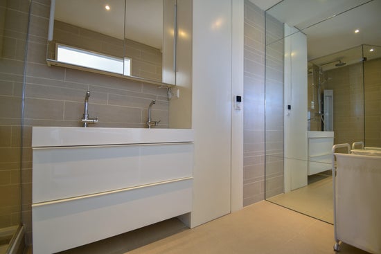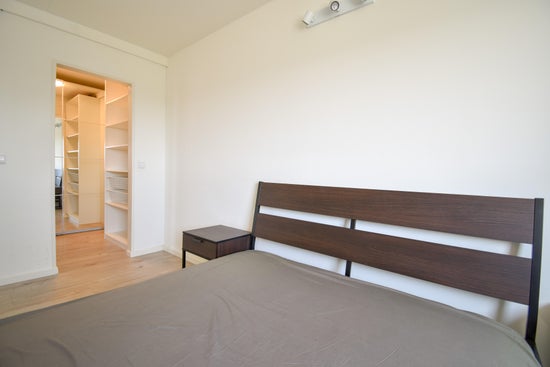 Aan de achterzijde van het appartement bevindt zich de ruime slaapkamer, compleet met een tweepersoonsbed en een walk-in closet. Vanuit de slaapkamer heeft u directe toegang tot de luxe badkamer, die is uitgerust met een moderne inloopdouche en een wastafel.
