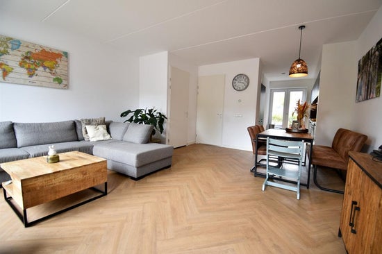 De entree van de woning is via de voortuin (gelegen op het zuiden). Via de ruime hal komt u in de sfeervolle lichte woonkamer met prachtige visgraat pvc-vloer en aangrenzend een terras (noordoost) waar u van de ochtendzon kunt genieten. De moderne tuingerichte open keuken is uitgerust met luxe inbouwapparatuur: een royale koelkast en vriezer, extra brede inductiekookplaat, oven, combimagnetron, vaatwasser en afzuigkap.