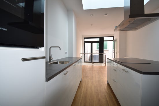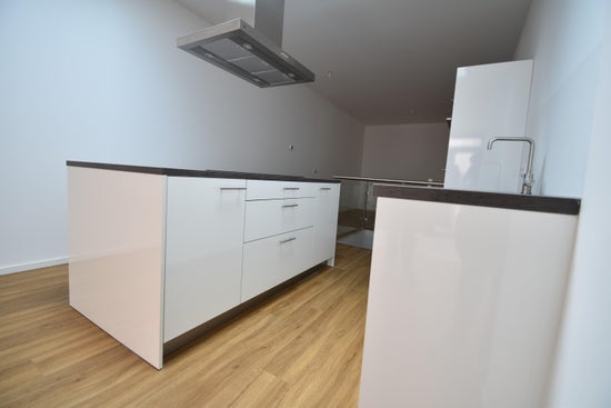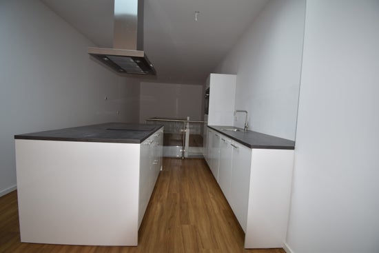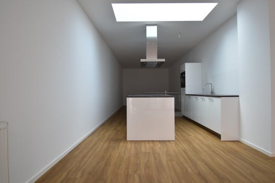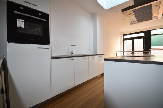 Het appartement is voorzien van een moderne laminaatvloer en strak gestuukte wanden. De keuken is compleet uitgerust met een inductiekookplaat, afzuigkap, oven, vaatwasser en koelkast.