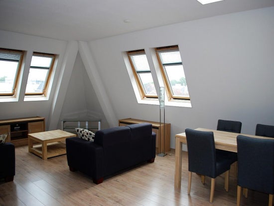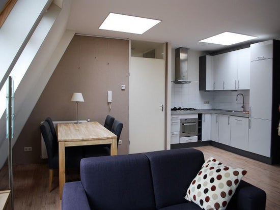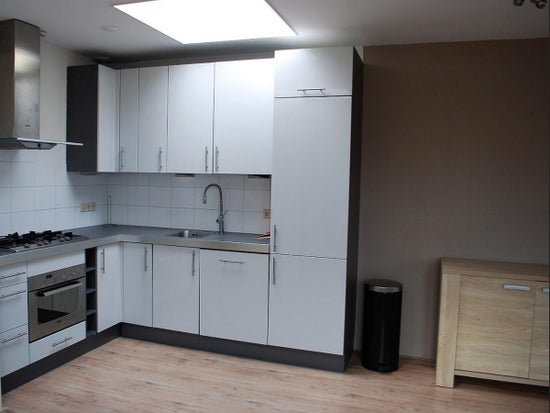 Via de trap bereikt u het appartement, gelegen op de derde (en bovenste) verdieping. De lichte woonkamer is voorzien van een mooie laminaatvloer en heeft dankzij de ligging op de hoek én twee lichtkoepels een fijne lichtinval. De open keuken is uitgerust met een vijfpits gasfornuis, afzuigkap, koelkast, vriezer, vaatwasser en combi-magnetron.